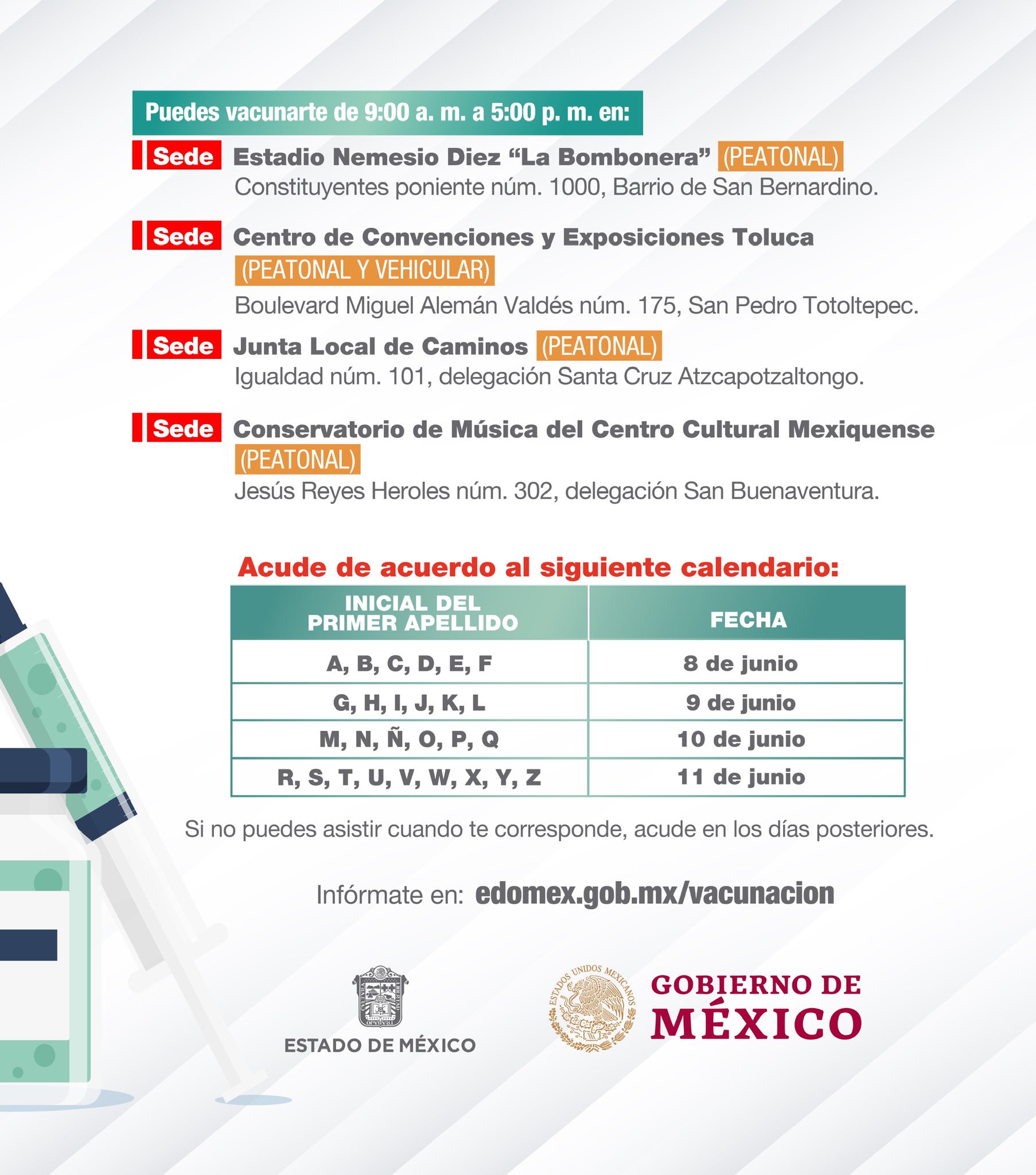 Gobierno Del Estado De Mexico On Twitter Atencion Del 8 Al 11 De Junio Estaremos Aplicando La Primera Dosis De La Vacuna A Los Adultos De 50 A 59 Anos Y Mujeres