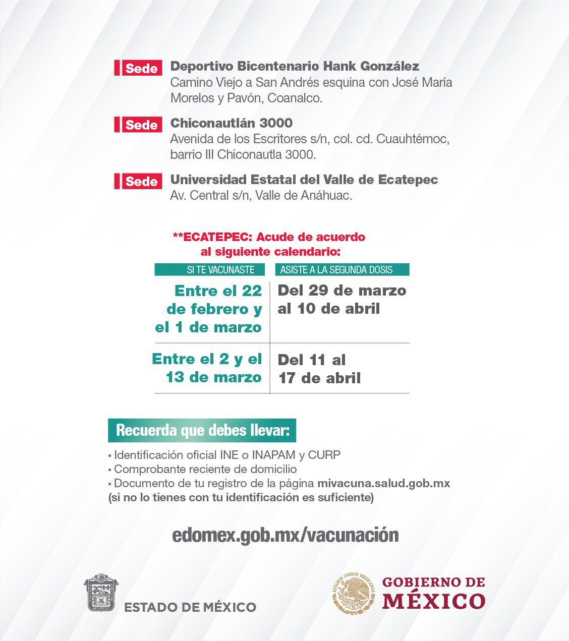 Gobierno Del Estado De Mexico On Twitter La Estrategiadevacunacion Continua En El Municipio De Ecatepec Tienes Hasta El 17 De Abril Para Acudir Por La Segunda Dosis De La Vacuna Contra Covid 19mx